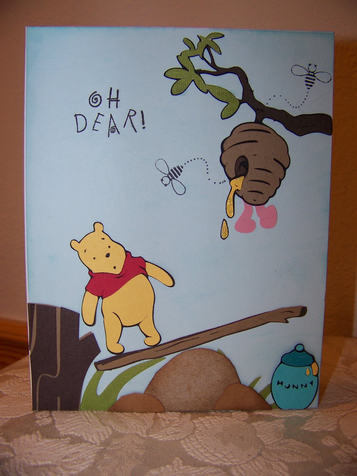 Sorry meant to have up yesterday but it was one of those days, everyone was calling and when I was trying to get finished the cats would say hey lets bother mom. lol Anyway okay I know some will think okay she is adult but I cant help but love how cute the new Winnie the pooh movie looks. Its just reminds me of my child hood and the simple time in life. And every time I see the movie trailer I say AWE POOH...lol So I thought in honor of the movie I would make a winnie the pooh card. I had bought this cart and had not used it so I thought what better time to open it up and craft with it. My gyspy was low on power so I had to play with the sizes so forgive me for not having the sizes of the cuts. Here was my inspiration.